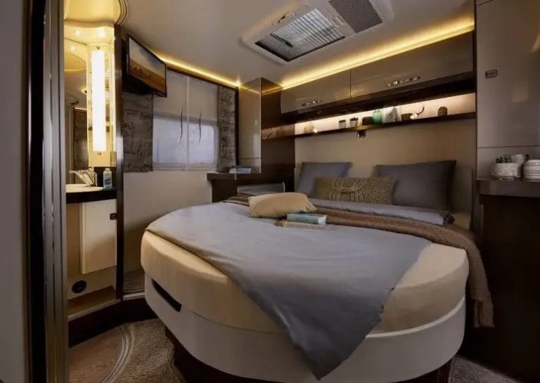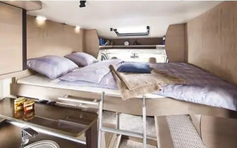 Denne autocamper har en stor dobbelt seng i bag og stor opbevaring under sengen.