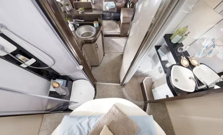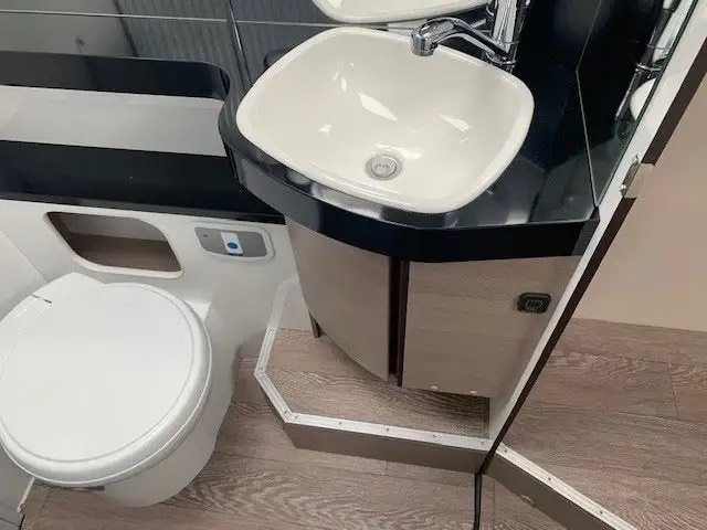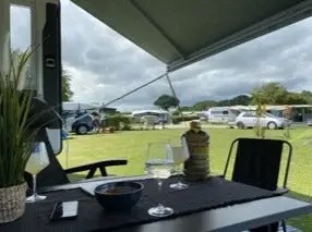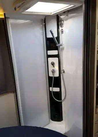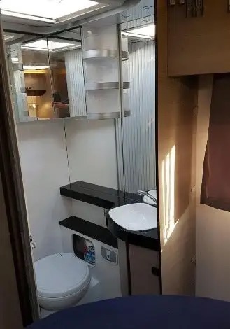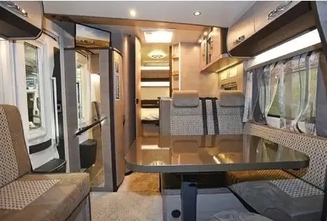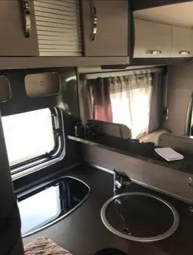 Stort køleskab der kan køre på el eller gas. Der er sidde gruppe til 5 personer, samt stort køkken og bad.